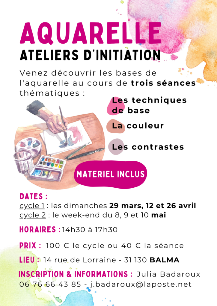 Stages et ateliers Ateliers d’initiation à l’aquarelle – Toulouse Venez découvrir l’aquarelle lors de trois séances thématiques de trois heures chacune en périphérie de Toulouse. Au programme : les techniques de base de l’aquarelle, la couleur et les contrastes. Chaque séance explore un thème au travers d’exercices techniques et la réalisation d’une aquarelle. Une séance dure 3h et sera entrecoupée d’une petite pause goûter conviviale. Dates du cycle 1 : dimanches 29 mars, 12 et 26 avril de 14h30 à 17h30 —-> 6 places disponibles Dates du Cycle 2 : week-end du 8, 9 et 10 mai —-> 6 places disponibles Adresse : 14 rue de Lorraine, 31 130 BALMA (accés par les bus 84 et 72 depuis Balma Grammont) Prix : 100 € le cycle (3 séances) ou 40€ la séance matériel inclus (aquarelles, pinceaux, papier) Pour plus de renseignements ou pour vous inscrire je vous invite à me contacter par mail : j.badaroux@laposte.net ou par téléphone 06-76-66-43-85.